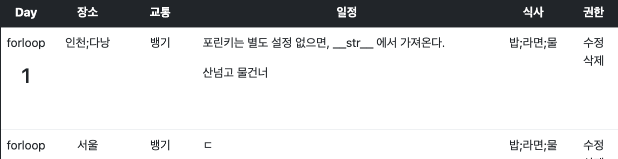 단, 일정표(iti) 모델의 food 필드는 '조식;중식;석식' 처럼 세미콜론으로 구분해서 저장돼 있다.