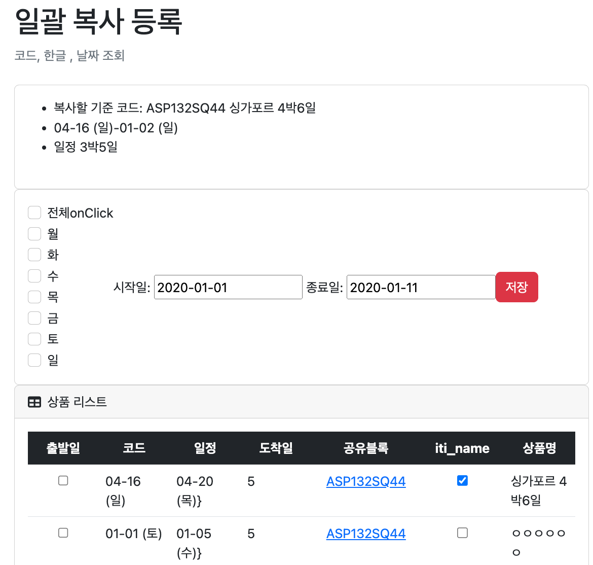 2. 복사할 원본상품을 클릭해서, 지정한 기간 동안 상품을 반복한다. ( --> 반복할 요일 input 받아서, list 로 만들기 )