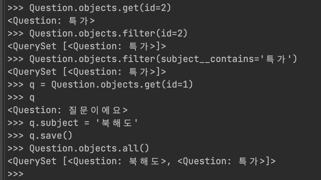이번에는 저장한 Question 데이터를 수정해 보자. 먼저 다음과 같이 id 값이 2인 데이터를 조회한다.
