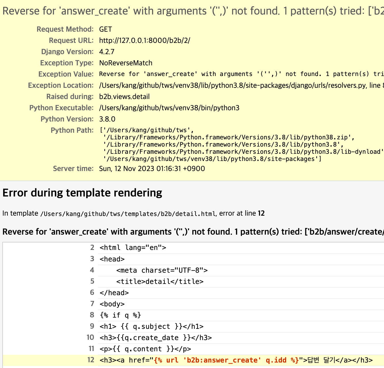 템플릿에 url 태그 사용하면, 전달할 인자가 잘못 됐다는 말.