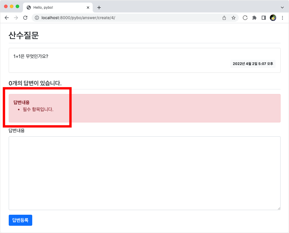 폼 에러 표시. form 안에 {% if form.errors %} 를 넣어서, 빈 필드가 있을 경우, submit 이 되지 않게 한다.