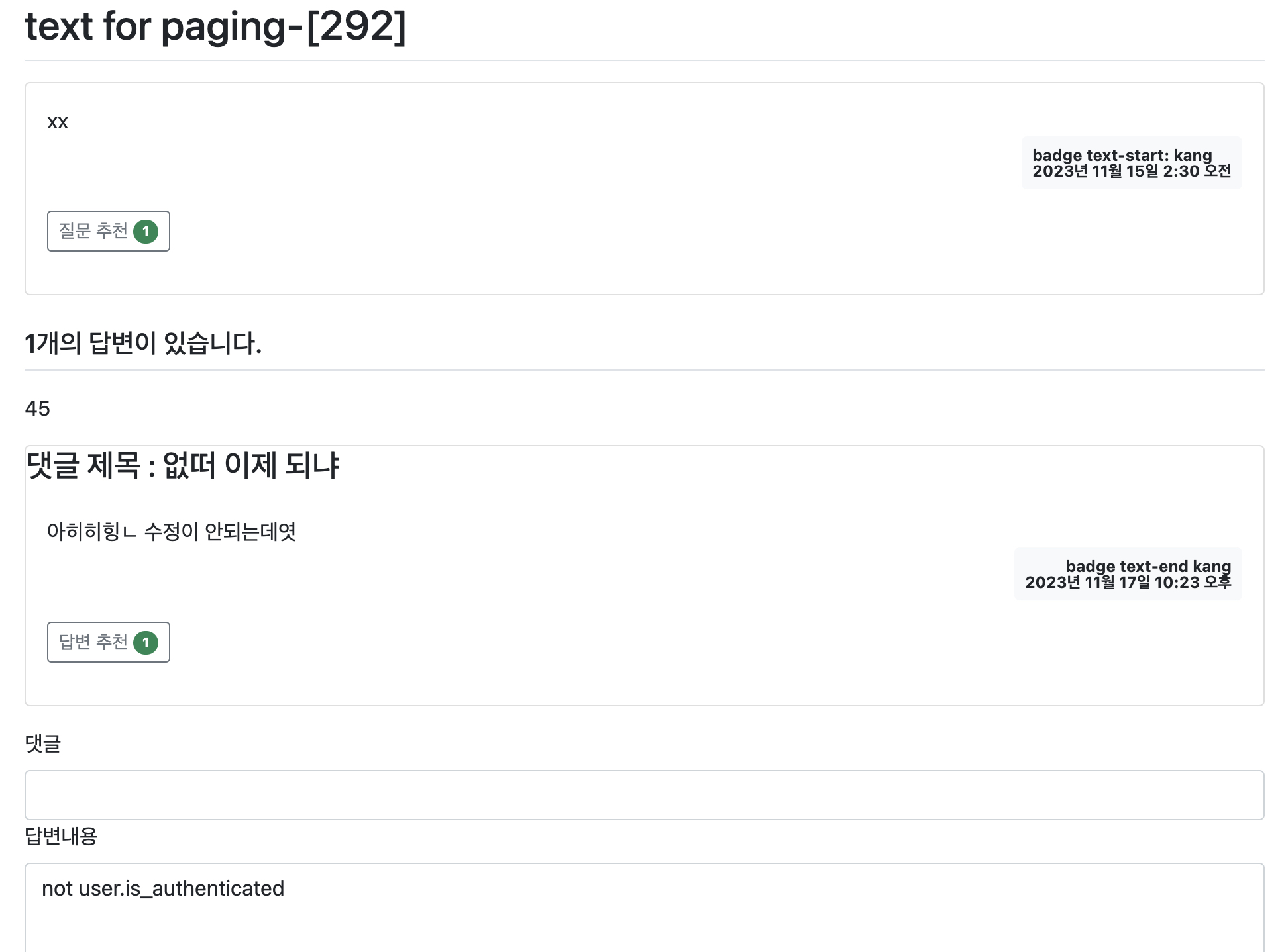 | 댓글 수: {% if question.answer_set.count > 0 %} (0) | 2023.11.15 |